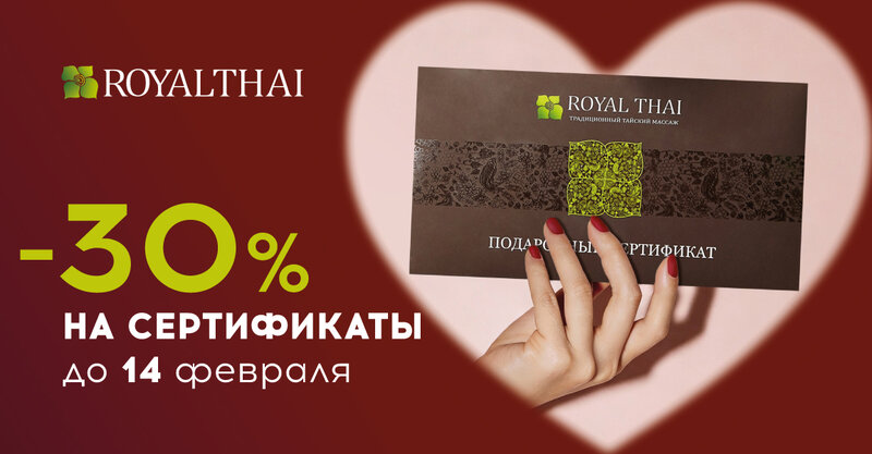 День влюблённых в ROYALTHAI! Скидка -30% на подарочные сертификаты до 14 февраля. Идеальный подарок для любимого человека: время для отдых...
