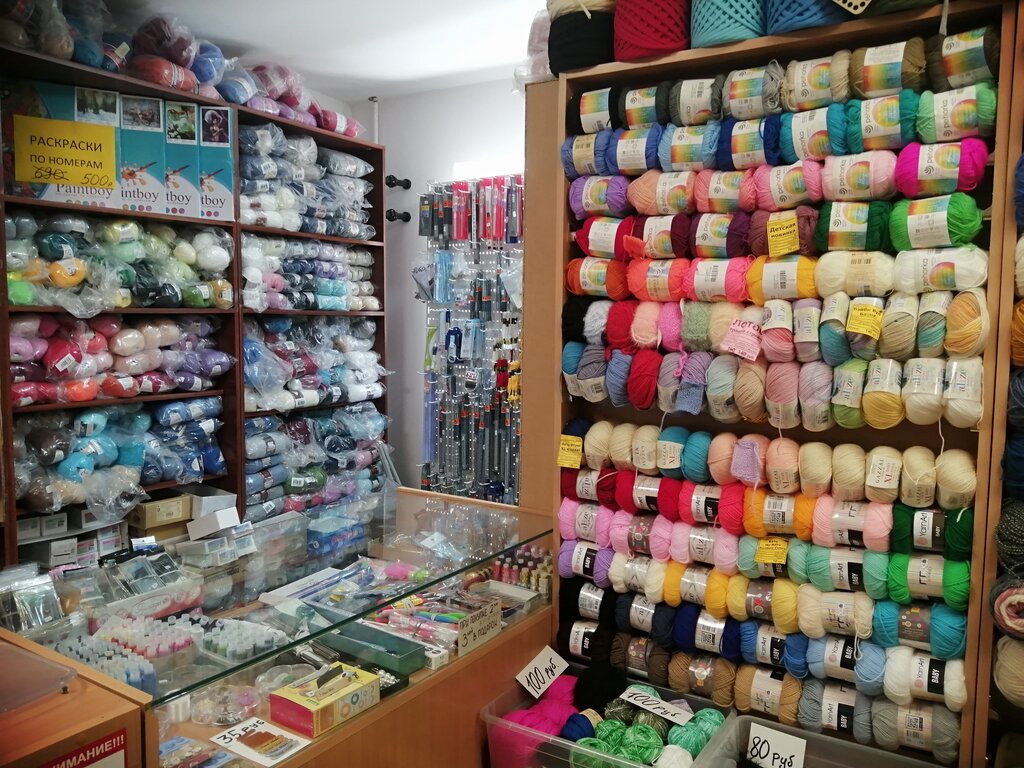 Хороший ассортимент пряжи и товаров для вязания.