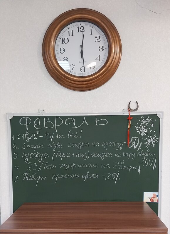Акции на февраль 2026 года!  1. С 11-00 до 12-00 скидка - 15% на всё!  2. При покупке две пары любой обуви  - скидка на одежду 50%! 3. ...