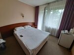 Отдыхала 10 дней. Гостиница, советских времён. Персонал доброжелательный. В стандартном номере расположение розеток не самое удобное. У кравати розеток нет. Фена в номере нет, из рыльно-мыльных только жидкое мыло для рук. Холодильник, чайник не большой есть. Завтраки на большого любителя. Ходила один раз и поняла что больше ходить не буду. Манная каша, рис с рыбой, сыр мягкий кусочек ну и чай, кофе. Ну за такую стоимость и на этом спасибо. Уборка символическая, уборка мусора и замена полотенец. На фото, простынь в номере, вилка в номере и завтрак. Территория не большая, довольно ухоженная, персонал подкармливает белочек благодаря чему утром можно на них полюбоваться. Где-то есть бассейн но говорят что для отдыхающих он закрыт. От центра города далековато, т. к город постоянно в пробках, довольно тяжело от гастишки куда то доехать.
