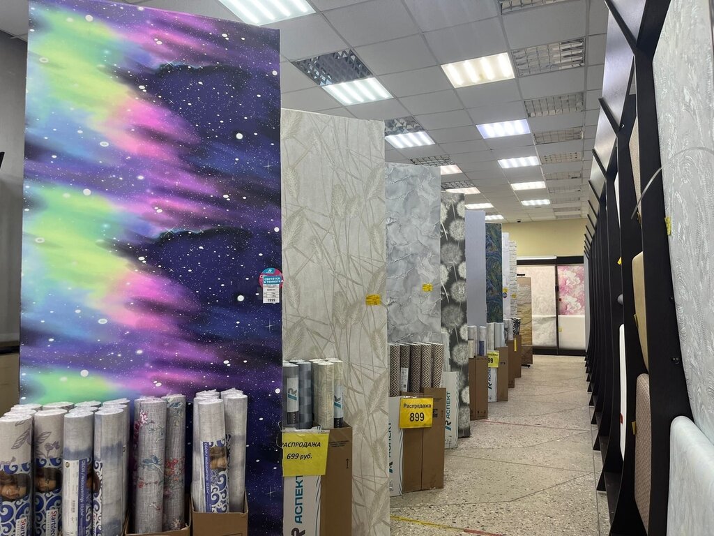 Большой выбор обоев цены приемлемые. Так же большой выбор паркета ламината и линолеума на любой выбор. Приветливый персонал.