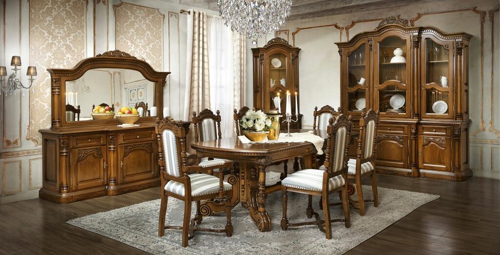 Буфет с витриной «Флоренция» — румынская мебель, вдохновлённая итальянским ренессансом: пышная резьба, овальное стекло в центре и колонны с ангелочками создают атмосферу дворцового величия. Четыре дверцы — две для хранения, две для демонстрации — ...