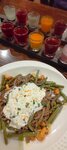 Классический гуляш из говядины с овощами: стручковой фасоли, лука и моркови, гречневой кашей (гречневая крупа сваренная на кокосовом молоке с добавлением сливочного масла), сыром пармезан, копченой сметаной и зеленым маслом