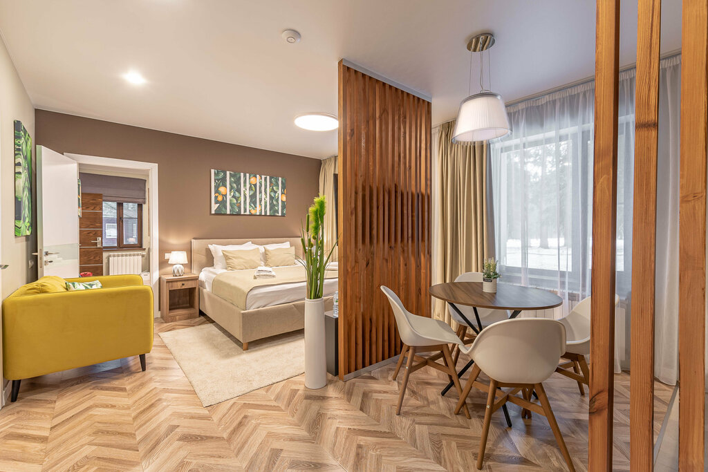 Бываем тут уже 2-й раз и будем приезжать еще! Место супер красивое и великолепное. Номера очень красивые, комфортные и со всем необходимым. Территория похожа на парк, благоустроенная, но к сожалению местами у них еще идет ремонт и не все закончено. Скоро вроде появится небольшой банный комплекс и различные развлечения (игровая комната) с конференц-залом. Когда закончат ремонт и сделают дорожку-спуск к речке, места тут наверное придется бронировать на год вперед). Администраторы и все сотрудники тут очень вежливые и всегда помогут со всем. Еда очень вкусная и порции большие, но опять же из-за того, что в ресторане ремонт выбор блюд пока что маленький, еду могут доставить в номер. Это место уже отличное, но когда они закончат все работы оно станет великолепным!