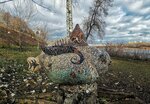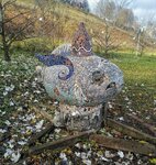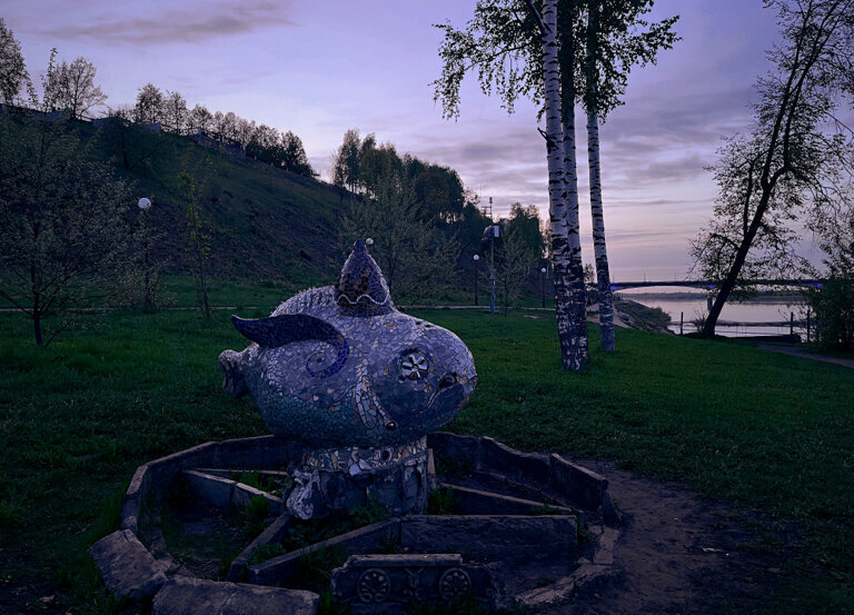 Старая советская скульптура, поверхность покрыта разноцветной мозаикой. На рыбу похожа, насчёт птицы – сомневаюсь, никаких внешних признаков птицы мы не обнаружили. Находится недалеко от ступеней лестницы, ближе к реке.