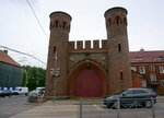 Закхаймские — одни из уцелевших ворот, доставшихся Калининграду в наследие. Они, строгие и достаточно простые на вид. А название им (вернее, деревянным на их месте) дал район, больше смахивающий на «деревеньку на лесной вырубке», где было полно убийц, *** и плутов. Ворота за подъемным мостом через водяной ров использовались как пешеходные и на ночь запирались, пропуская при надобности лишь доктора или священника. По приказу Фридриха II ворота к 1755 стали кирпичными, но нынешний вид они приобрели в 1860-65 гг. и в составе оборонительного кольца укреплений до конца 19 в. служили пропускным пунктом на въезде в Кёнигсберг. С утратой военного значения военное министерство избавилось от ворот, передав их властям города, оставивших от них после застройки территории лишь небольшую часть. После войны ворота как только не использовали, пока реставраторы и строители, вложив обращение потомкам со своими именами и фото в «памятную капсулу» и замуровав его в стену по окончании работ, не передали-таки постройку федеральному бюджетному учреждению, связанному со стандартизацией, метрологией и испытаниями в регионе. Осматривая фортификации бывшего Кёнигсберга, и мы не упустили случая сюда заглянуть. В здании ворот действует выставочное арт-пространство, куда при желании можно зайти, в зале есть кофейня, а рядом — небольшая зеленая зона. Особых восторгов постройка не вызвала, но увидеть исторические ворота все равно было полезно.