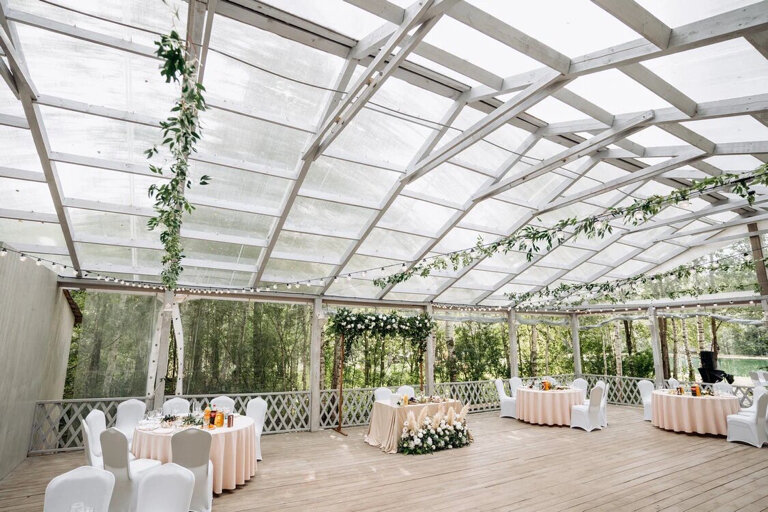 Просто веранда в лесу на берегу речушки, мощеные деревянные дорожки. Красиво, живописно. Есть туалеты с водой. От комаров обработано, но вечером все равно покусывают. Для небольших уединенных мероприятий подойдет.