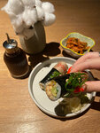 Интерьер 7/10 Относительно небольшое помещение в стиле лофт, обильно декорированное в ориентальном стиле. Под потолком висят полотна с иероглифами, по стенам расставлены манэки-нэко и бутылки из-под сакэ. Вдоль дальней от входа стены тянется барная стойка. Посадка неравномерная: у входа столиков больше, чем в глубине зала. Если повезет, можно занять тихий столик на двоих у самого бара. Кухня 5/10. Закуски цукэмоно - очень плохо. Если битые огурцы просто невыразительны, то капуста кимчи - испорчена. Официант пытался что-то объяснить насчет поставок и особенностей партии, но вкус и последующая реакция организма говорили сами за себя. Креветки темпура тоже ничем не запоминаются: толстый неравномерный кляр, обыкновенный ореховый соус с легким привкусом манго. Такие же креветки готовят в любом заведении паназиатской кухни. Роти лосось и авокадо следовало бы назвать салатом, потому что доминирует в блюде зелень. Авокадо и лосось представлены чисто номинально. Отдельного упоминания заслуживают коктейль "Сухие сады Соами". Помимо подачи, включающей трехминутную лекцию от официанта, посвященную саду камней, это просто довольно крепкий коктейль на основе джина и рислинга и бузины. При употреблении данного коктейля обещают просветление, но для полного "просветления" их нужно выпить два. Обслуживание 6/10. Обслуживание чуть выше уровня закусочной. Официанты меняются в процессе подачи, само обслуживание неспешное. Упомянутую выше проблему с кимчи не решили вообще никак. Итог. Заведение для туристов, ориентированное на гостей, которые точно не придут во второй раз. Если и заслуживает посещения, то исключительно в качестве локации для селфи.