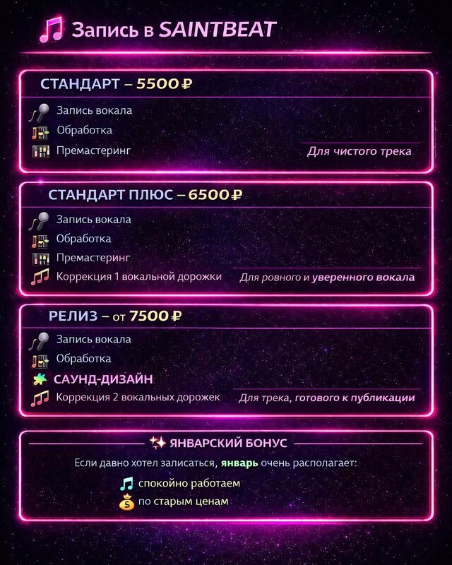 1500 руб - Аренда студии от 3 часов 1500 руб - Час записи 1-2 чел 2500 руб - Час записи от 3 и более людей