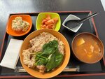 Это белый рис, говядина, жареное яйцо, свежие огурцы, морковь, соевые ростки, листья шпината и салата айсберг, а также репчатый лук. Завершает вкус острая перцовая заправка, кунжут и водоросли нори
