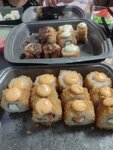 Variety of food:sushi and rolls, pizza