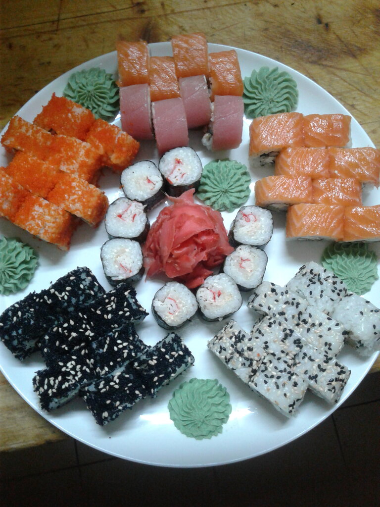 Variety of food:sushi and rolls, pizza, home cooking