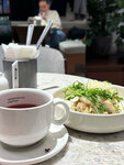 Вкусный завтрак с рыбой, скрэмблом, авокадо и тартином. Порция хорошая. Красивая подача, быстро приготовили. Кофе тоже превосходный. Обслуживание на 5+. Посуда красивая, брендированные чашки. Красивое оформление, очень уютно. Хочется вернуться для неторопливого завтрака с беседами. Кофейня маленькая и очень атмосферная. Вдвоем можно разместиться комфортно. Компанией советую выбрать более просторное заведение.