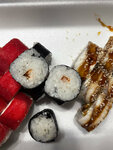 Рисовая каша,вымоченная в соевом соусе, очень напоминает кашу с тушонкой. Безумно ужасный заказ приготовили, за 1700р сет никакой. Мало того, вместо обещанных 1,5 часов... Ждали часа два, если не больше. Столовский рис с рыбой. Ситуацию спасли пару видов роллов, и то не сильно.