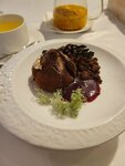 Сырая оленина — как северный воздух: свежая, тонкая, живая. Хруст фиолетового картофеля — земля, давшая цвет и силу. Перепелиное яйцо — тепло жизни. Соус с зеленью — тишина леса, собранная в капле. Каждая деталь — уважение к природе и вкусу.