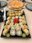 Сыр моцарелла, томатный соус, кунжут, сыр филадельфия, лосось