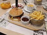 Сочная говяжья котлета с хрустящим салатом из капусты с морковкой, ломтиками томатов, луковым чатни, дополненный соусами чеддер и барбекю. Подаётся с картофелем и соусом маргарита