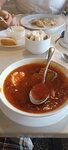 Заехали пообедать по дороге в Дербент. Меню почему-то нет, его рассказывают. Борщ волшебный, с огромным куском мяса, красный, дивный. Пельмени местные - тоже хороши.