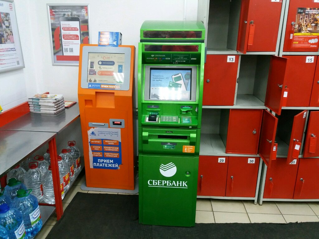Банкомат Сбербанка в магазине Магнит. Есть возможность получения наличных. Оплатить коммунальные платежи по сканеру штрих-кода не получается (лично неоднократно пробовал). Нет возможности внесения наличных.