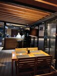 Вечером, перед просмотром спектакля, зашёл на ужин в ресторан ... Обстановка в стиле минимализм-мне очень нравится, мебель удобная, есть ступенчатая открытая трасса с видом на море. Вечером уютно, не громкая музыка. Заказ приняли быстро, блюдо готовилось 25 минут в здании отеля рядом с павильоном. Подача рыбы красивая. Рыбу эсколар ел впервые, вкус у неё необычный. За обстановку, обслуживание и вкусную, необычную рыбу. - пять звёзд. Но цены высокие, видимо, из за вида на море и стильный павильон.