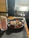 Пришла днем с целью покушать сырники (так как большая проблема в ресторанах найти днем сырники) Заказала с молочным коктейлем. Коктейль молочный клубничный химический. Не ощущала никакой натуральной клубники. Подача обычная Сырники вкус 5/5. Подача 3/5 Ягоды разбросали хаотично. Не особо эстетично. Отдала около 1200 за 2 сырника и молочный коктейль. Не стоит своих денег Мебель внутри не понравилась. Не удобная. Салфетка эконом класса. Могли бы в ресторане салфетку из хлопка подать, красивую. Но эта просто стрем. Меню маленькое, без фотографий еды (как так??! Я в ресторан иду за эстетикой, как мне заказывать еду, не видя фото?!) Так же везде в меню добавки, специи всякие, масла, овощи. Нет пиццы в меню. Нет пуэра из чая. Людей в выходной мало, музыка не играла или играла супер тихо