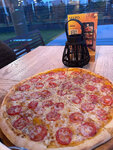 Колбаса, пепперони, ветчина, бекон, курица. Пицца на тонком тесте
