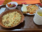 В целом расположение и готовка норм, порции достаточные. А если придираться, то запечённая картошка перченая (следует учесть тем, у кого повышенная чувствительность к острому в виде моментального потения лица и т.п.), но вкусная. Коллеге не понравился плов совсем, на выброс, но подробностей не знаю, не распрашивал. Куриное филе с овощами норм. Шницель размером с 1,5 мужские ладони, тоже вроде норм. Капучино аппаратный не Макдональдс, пены совсем не почувствовал, хотя по вкусу кофе как кофе. Чистое кафе, большинству должно понравиться. Туалет есть, тоже чистый