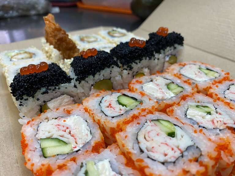Новое кафе на Красноармейской у остановки Таксопарк порадовало своим ассортиментом. Заказали сет #11 "Филадельфия" с самовывозом к определенному времени. При телефонном разговоре милая диспетчер сказала, что готово будет через 15 минут. Это порадовало. Приехали забирать заказ на 15 минут раньше оговоренного времени и дозаказать пиццу, которую сделали за это время. По итогу могу сказать, что детям очень понравилась пицца. Тесто тонкое, начинки много. Роллы очень вкусные. Будем заказывать ещё.