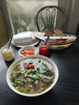 Очень вкусный Фо Бо, говядина тает во рту, к супу вкусные добавки: маринованная морковь и чеснок с красным перцем Чили, острый соус и 2 хвороста) Мыксао -кальмар с овощами в сковороде бесподобный)