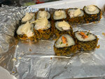 Запеченные роллы : мидия хот, ролл с лососем, чикен ролл запеченный, спайси запеченный с цыплёнком Жареные : Оливье темпура, Темпура Чука со спайси соусом Классические: Окунь в зелени, Калифорния с крабом микс соевый соус, имбирь, васаби
