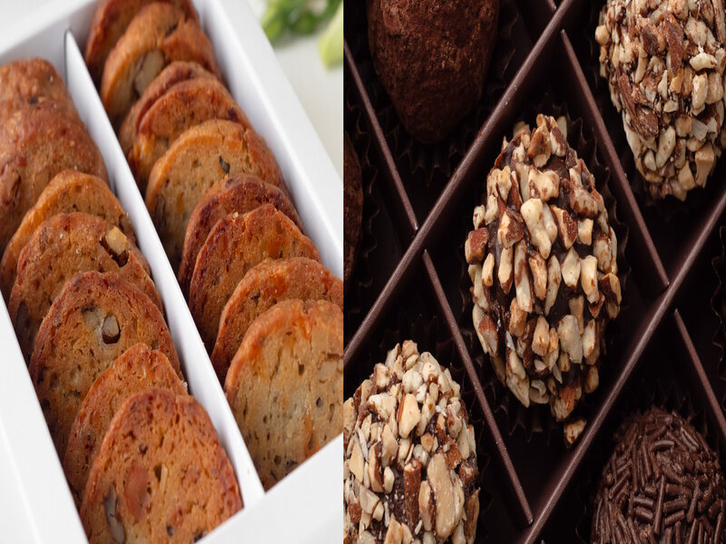 Классические пирожные из свежей бисквитной крошки, с кремом на основе сливочного масла и какао, с добавлением коньяка. Посыпаны какао и сахарной пудрой, украшены белым сливочным кремом.