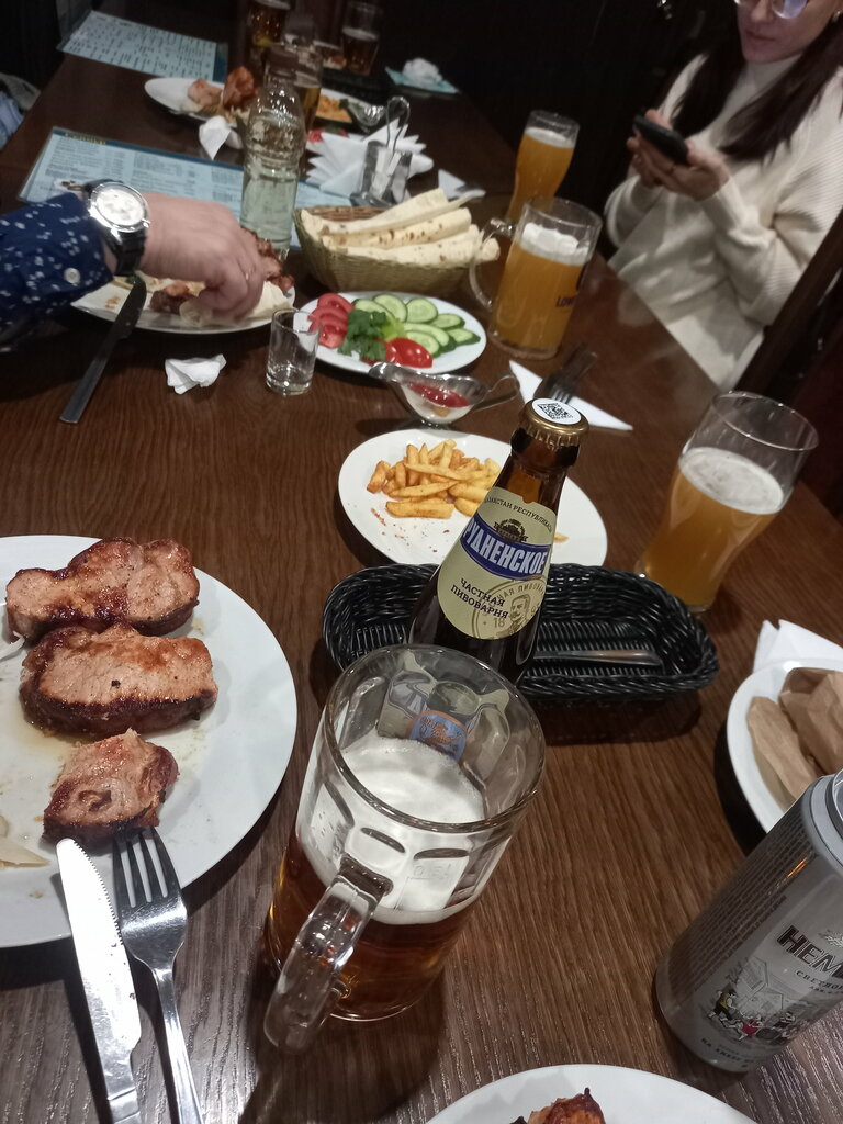 Хорошая шашлычная, большой выбор мясных блюд. Также можно выбрать салаты и десерты . При условии заказа в зале , крепкий алкоголь можно свой. Отзывчивый персонал.