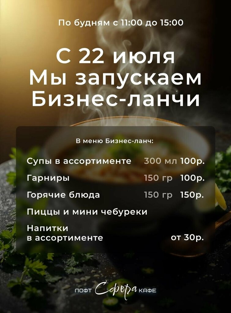 Суп (300мл) - 100р. Гарнир (150гр) - 100р. Горячие блюда (150гр) - 150р. Напитки (в ассортименте) - от 30р.