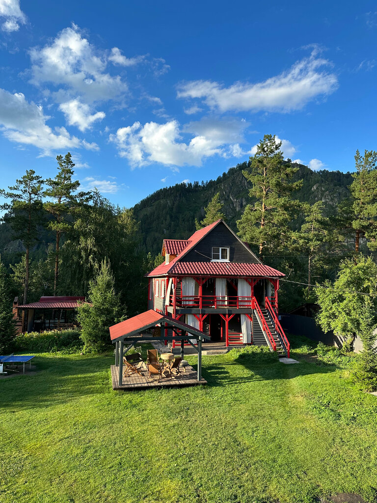 Место так себе. Выбрали заранее по информации на их сайте . На котором небыло информации, что :1. Нет спуска к реке, хотя действительно расположен на берегу Катуни. 2. Так же на сайте нет информации, что направление строго веганское, граничащее с сектой. Включенный завтрак естественно соответсвующий 3. Алкоголь под запретом практически в любом проявлении. Даже если вы немой и априори шуметь не можете (впрочем наша компания никогда себя шумно и не вела). Впечатления остались весьма двоякие. С одной стороны все чисто и достаточно аккуратно . Но...место рассчитано на определенных "своих", к которым мы не относились явно. Посетить данное заведение второй раз, желания нет совсем . Будьте внимательны при выборе этого дома открытого диалога. Хотя безусловно , кому то этот псевдорай будет по душе . Приятного всем отдыха, мира и взаимоуважения!