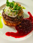 Сочный бифштекс из говяжьей вырезки с нежным трюфельным соусом и легкой кислинкой брусники. В сопровождении-золотистый картофельный драник , яйцо пашот и хрустящий лук. Блюдо,в котором идеально сосчитаются сила вкуса и уют домашнего очага