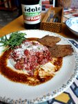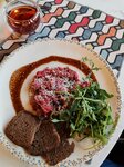Приезжали в Орел с супругой на несколько дней, чтобы она могла отдохнуть и побывать в городе,в котором училась. Мы были после дороги ,было уже 20,а я и после работы, хотя и не такой длинной,от Брянска не так далеко,но хотели вкусно поесть, и посмотрев на отзывы,решили посетить это место. Можно сказать,что заведение пользуется популярность,было много занятых столов, на летней веранде и в основном помещении. Предложили место на летней веранде, заказ приняли достаточно быстро,спасибо за это официанту Владимиру,отдельное спасибо ему за помощь в выборе коктейля,но об этом дальше. Блюда ждали долго,скорей всего сказалось видимо наполняемость,но можно сказать больше подогревали аппетит, плюс коктейль предложенный Владимиром отлично скрашивал время ожидания, моя супруга редко пьет алкогольные напитки, но глядя на то,как 1/3 бокала испарилась с ее помощью,можно сказать,что стоило прийти только ради него. Что касается блюд, то мой бефстроганов с пюре был очень вкусным,супруга заказывала котлеты котлеты ,тоже с пюре и борщ.Мне как показалось ее пюре,было чуть менее сливочным,чем мое, но может быть соус от бефстроганова сделал свое дело в этом плане.Хинкали с говядиной прошли для меня без каких-то впечатлений. Но главное!Когда ты приходишь в ресторан ты хочешь вкусно поесть и уйти сытым, поэтому порции,что борща,что хинкали,они большие,бефстроганова,после него захотелось самому попробовать приготовить блюдо, и пюре с котлетами,большие и ты сможешь хорошо поесть и провести время. Отмечу также отличные интерьеры,удобные кресла и приятную,красивую цветовую гамму. Был конечно минус,поскольку ем с хлебом еду обычно,то заказывал себе лепешку, вот ее не принесли,чек не забирали может ее и не было,ее стоимость не так важна, забыл потому что супруга отдала свой хлеб со смальцем,который подают вместе с борщом,тоже очень вкусно. Несмотря на это,впечатления от посещения данного заведения только положительные.Твердая 5 от меня! P.S.Автор коктейлей и бармен,вы топ!!!