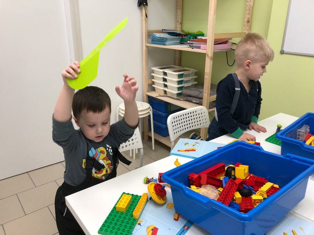 В возрасте 4-5 лет на занятиях дети изучают основные узловые конструкции, из которых состоит любое техническое устройство современного мира; знакомятся с такими понятиями, ось, балка, зубчатая и ременная передачи и др. 1 учащийся = 1 набор Lego.