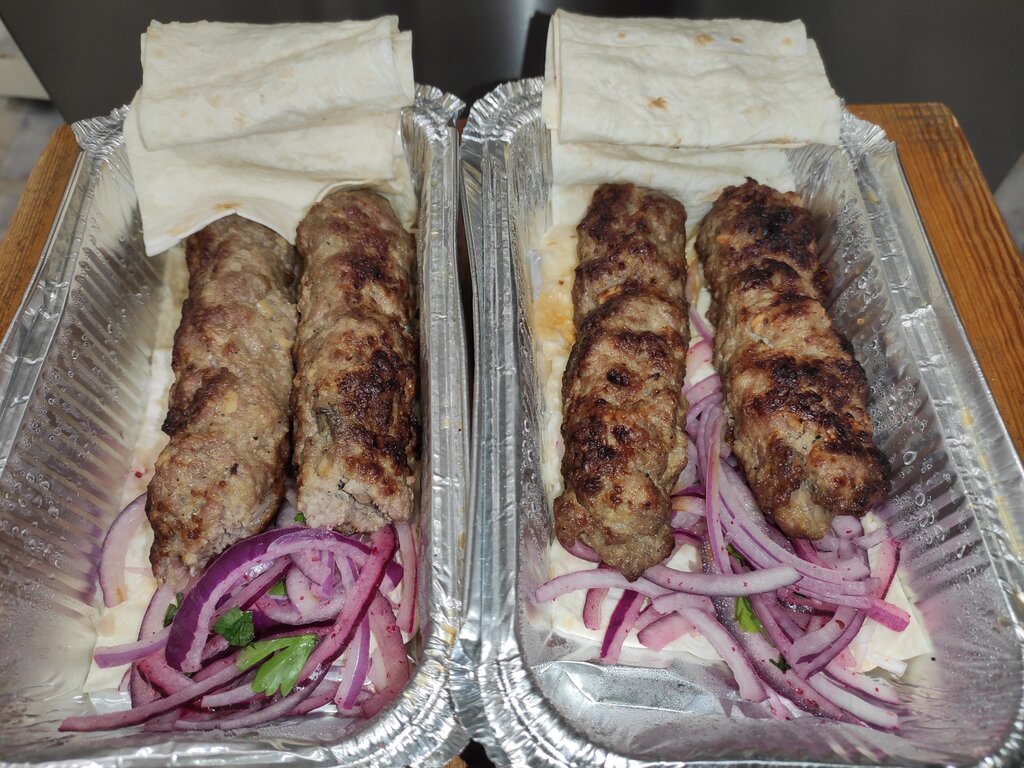 Захотелось шашлыка, решили попробовать заказать в этом месте. Искали где делают именно на углях нормальных. В этом месте все хорошо с углями). Заказ на две шавермы из баранины и два люля-кебаб из баранины приняли по телефону в мессенджере, сказали будет готово через 30 минут. Общая стоимость вышла на 1300 рублей. 300р стоит 1 шаверма и 350 стоит 1 люля-кебаб. Все аккуратно сложено и обмотано в фольгу. Даже оказался 1 соус в комплекте из томата, хотя мы его не просили, возможно идет допом к люля-кебаб. Начнем с шавермы, она сочная, много овощей(фото сделал в разрезе), соус вкусовые качества не перебивает, нет какой-либо вкусовой однородности, но и нет выраженности какого-либо одного ингредиента т.е чувствуется и помидоры, и лук, и соус, и баранина и в совокупности получается уловить разные вкусы, которые друг друга не перебивают допустим, как у некоторых одной солью или соусом. К тому же шаверма сама по себе достаточно крупная. Мясо баранины в шаверме как я понял лежит не слайсами(ломтиками), а наподобие кусочков ляля-кебаб. Будем пробовать еще. По стоимости за продукт судить трудно, надо сравнивать другие предложения и вкусовые качества. Как всегда хочется, чтобы было дешевле без потери в качестве и объемах, но не всегда желания клиентов совпадают с возможностями предпринимателей. Люля-кебаб. Открывая бокс мы видим лаваш, который укрывает, порезанный красный лук и два кусочка люля-кебаб. Люля -кебаб, был достаточно сочным, ни в коем случае не сухим, достаточно жирным. На первый взгляд кусочки кажутся небольшими, но после шавермы понимаешь, что этого достаточно взрослому человеку. По вкусу скажу субъективно, лично мне не хватило вкуса "баранины", как-будто его там мало было. Но повторюсь, это субъективная оценка. Могу посоветовать класть салфетки на самовывоз и пластиковые вилки в индивидуальной упаковке к шашлыку или люля-кебаб. Возможно клиенты пойдут не домой, не в заведение, а сделают заказ, подъедут, заберут и поедят в машине. Может быть это дается бесплатно, если попросить, не уточнял, но все же, если это не так, то можно этот момент при заказе уточнять, либо сразу класть. По соусу для люля-кебаб, можно тоже немного поколдовать с вкусовыми качествами, показался слегка пресным. Подводя итог, в целом все понравилось, будем заказывать еще!