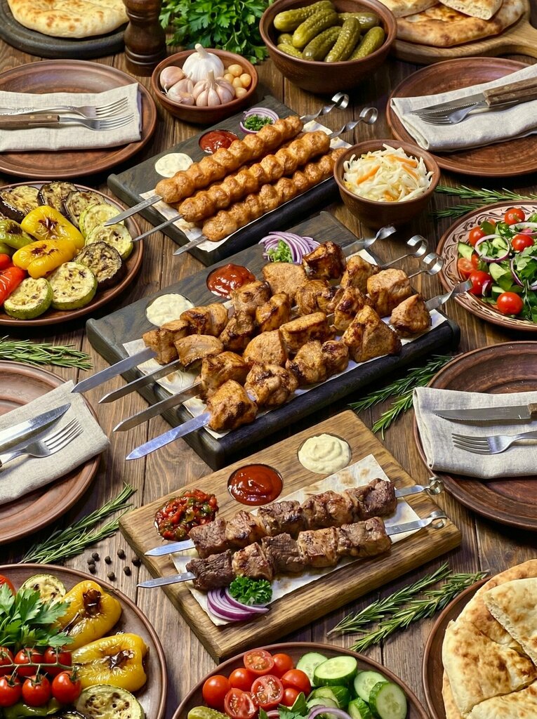 Variety of food:home cooking, shashlik, healthy eating, georgian food, grill