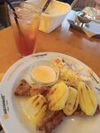 Взяли 3 порции куриного шашлыка навынос, в 2х из них картофель жареный. Шашлык не дожарен, картофель полусырой, не хрустит ни разу, тянется, как резина. Никакого удовольствия и вкуса.