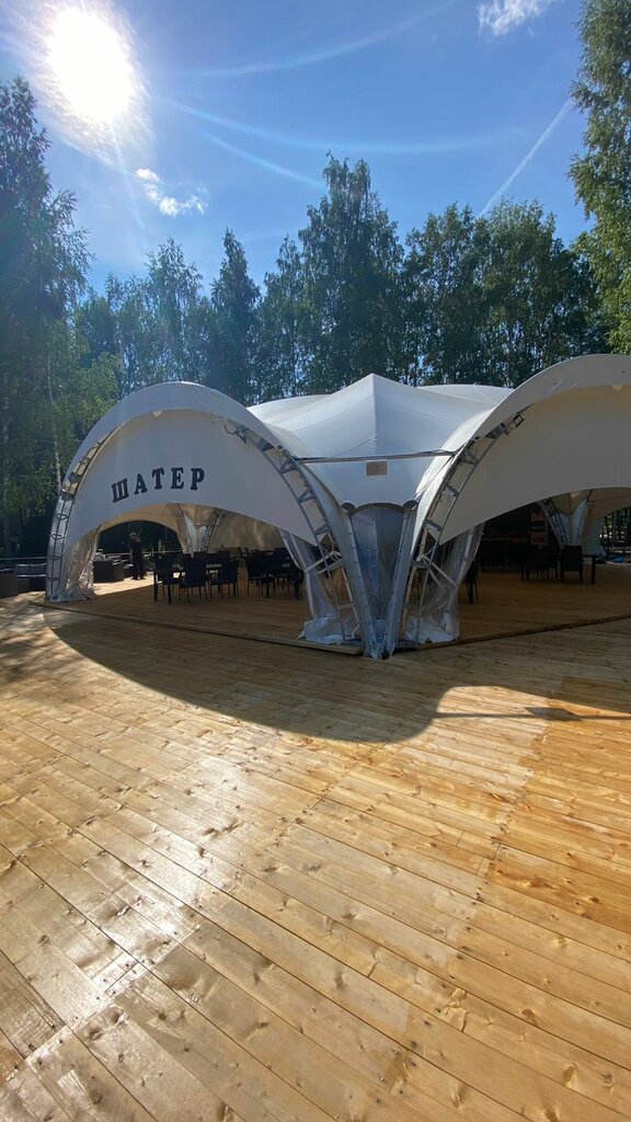 Очень часто ездим купаться на карьеры. Шатёр находится около 5-го карьера. Огромный плюс-цивилизованный туалет! Да, он платный, но 30 р. это нормально. Вода 0,5 стоит 60 р, мороженое-180, в меню есть горячее, заказывают шашлыки. Мы их не брали, не знаю как по вкусу, но выглядели аппетитно! В шатре днем народ не собирается, скорее всего тусовка начинается ближе к вечеру?!🤷🏻‍♀️ Музыка играет и днем, нравится, правда иногда репертуар подкачивает, услышала песню про молодую алкоголичку-это нечто🙈