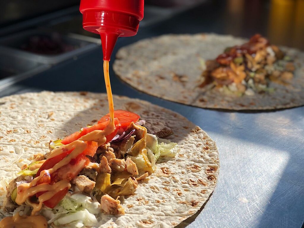 Приятно удивило, что в точке появились позиции с бургерами — давно этого не хватало. Пробовали острый бургер: очень зашёл. Отличный соус, правильная острота и удачное сочетание с перцем халапеньо — вкус яркий и сбалансированный. Отдельно отмечу шаурму — выбор, пожалуй, самый большой в городе. Есть классика с курицей и говядиной, но также варианты с креветкой, рапанами и даже с ананасами. Такого ассортимента больше нигде не встречал. Очень порадовал бабат фри, мало где можно встретить в городе. Готовят быстро: бургер и шаурму отдали примерно за 10 минут.