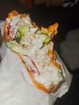 Отличная, вкусная, большая шаурма. Вкусное маринованное жаренное мясо в большом количестве, свежие овощи, хороший соус