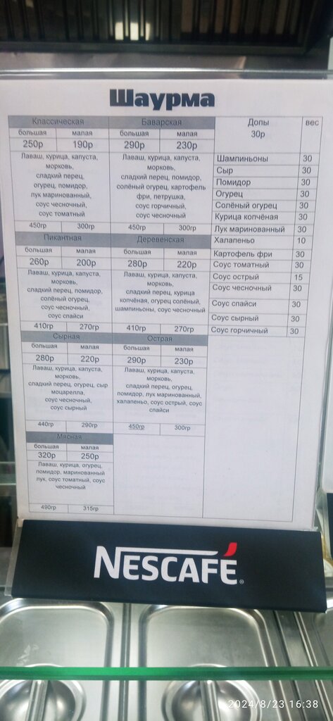 Не рекомендую... по вкусу "неплохо" - не более! При заказе трёх больших (по 490 грамм) дали существенно меньше, не поленился и сходил в ближайшую "монетку"...вес примерно 380 грамм каждая. Вернулся. На резонный вопрос: "Почему так мало?", последовал ответ: "Всегда так делаем!". Хотел вернуть деньги - девушка сказала сделает ещё одну. В итоге четвертая "большая" шаурма отправилась в урну, по причине наличия в ней замороженного куринного филе! До закрытия было примерно 30 минут, возможно повлияло это... но на мой, субъективный взгляд - это дно!🤦‍♂️