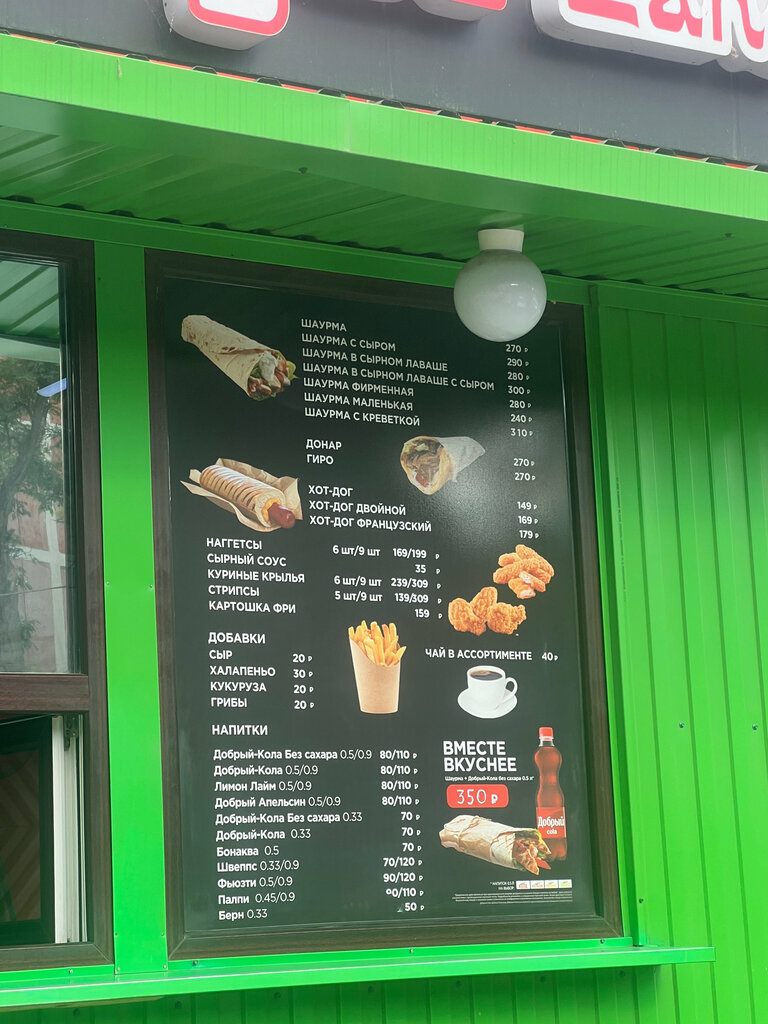 Шаурма, не сказать, что очень вкусная. 4 звезды. Что то среднее между не вкусным и вкусным. Мясо кладется на глаз, человек не знает сколько весит шаурма.3 звезды. За 300 рублей, в сырном лаваше с сыром 250 грам +-, что то маловато.2 звезды. Пока за пять минут дошел до дома, шаурма сама разделилась на пополам. 1 звезда. Единственное что радует, что кладется картошка фри бесплатно. 2 звезды. Время ожидания радует. Отдали шаурму где то за 2-3 минуты. Встретили вежливо. Так еще и нету графика с номером телефона 🤣