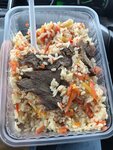 Взял "плов", по факту отдельно сваренный рис с положенным сверху в меру жующимся ОТВАРНЫМ куском мяса. Назвать это половом мне бы совесть не позволила. Но есть можно.