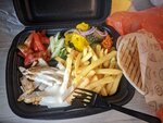 Кебаб не висит, картошки кладут много, есть даже маринованный огурец. Мяса на 4ку, но зато нарезано хорошо. С питой в принципе наешься. Для полноценной 5ки не хватает только тарелок. Есть из контейнера не смотрится в красивом заведении