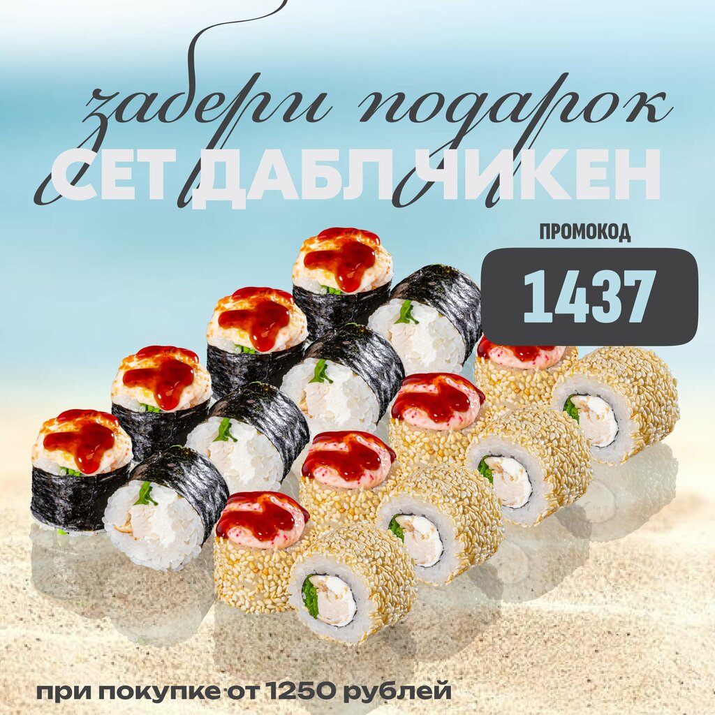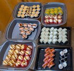 Запеченный мини с кальмаром, запеченная Калифорния, Запеченный с окунем, Запеченный острый с креветками, Запеченный острый с крабом (40 шт.). Подаётся с соевым соусом (30 мл), имбирём (30 г), васаби (10 г)