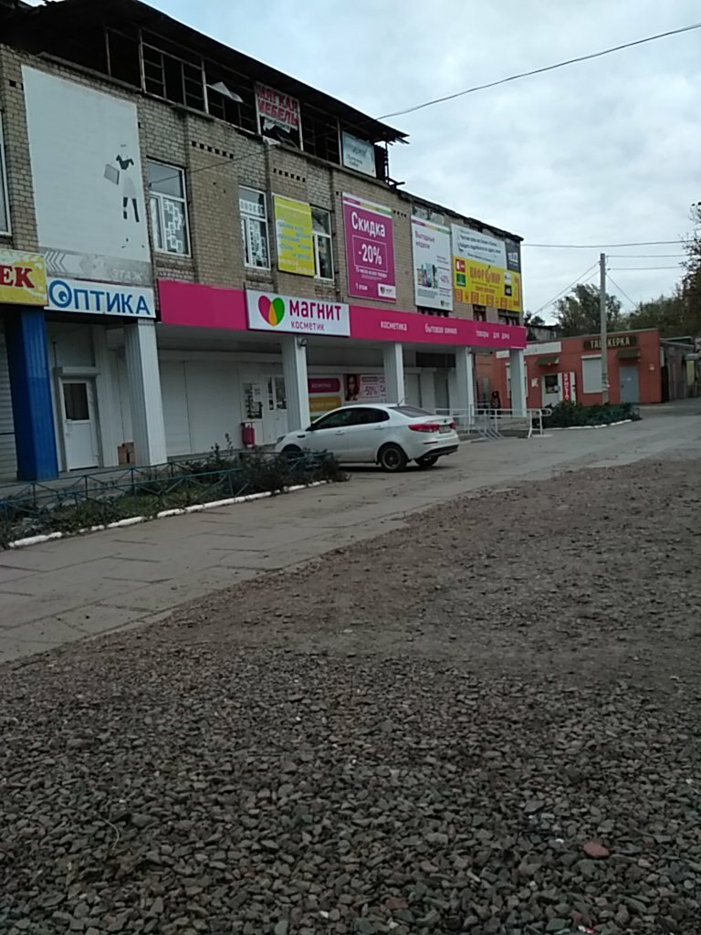 Центр посёлка. Есть много места для парковки. В одном месте собрано несколько магазинов: первый этаж занимает Магнит-косметик, а на втором теперь открыли Фикс-прайс. Рядом овощной рыночек, молочный ларек, хороший магазин хозтоваров, продуктовые лавки.
