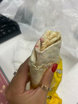 Лаваш, жареная курочка в домашнем маринаде,овощной салат из свежих капусты и морковки, огурчик свежий, соус фирменный чесночный, острый перчик халапеньо Вес: 340гр.